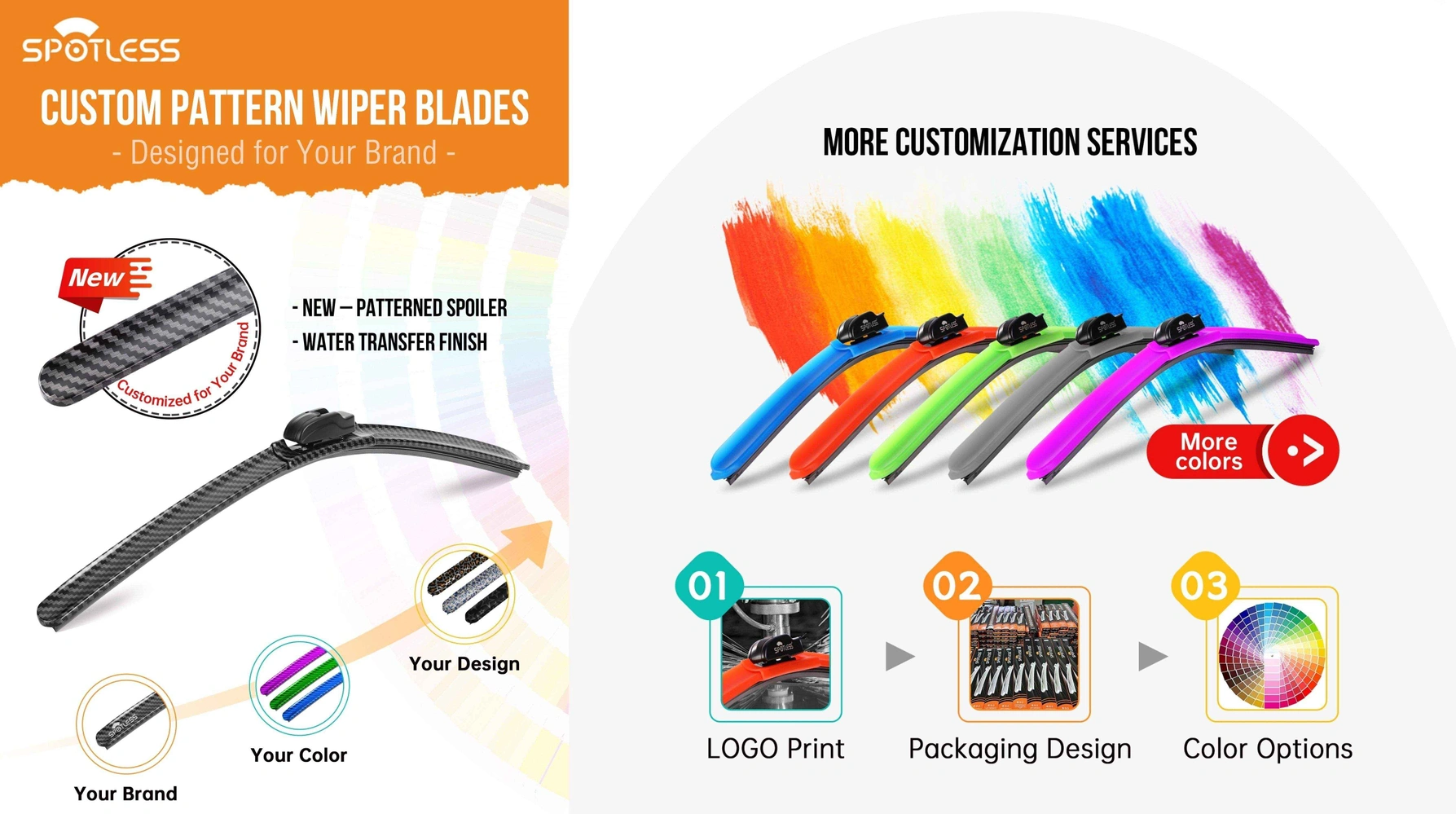 At SPOTLESS, we offer customized windshield wipers to wholesalers and retailers, ensuring stable quality and providing flexible brand promotion solutions.If you are looking for a reliable partner for your own brand, feel free to email wiperblade8@xmyujin.com or Contact us. We can share certification documents, customization cases, and sample timelines to help you evaluate.
